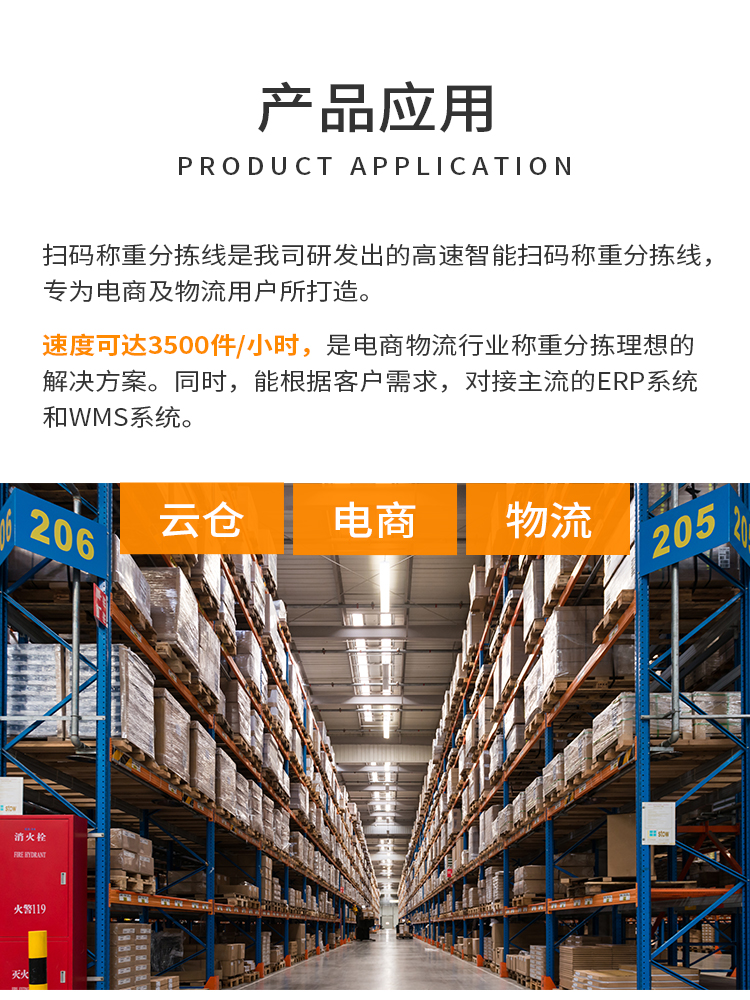 本產(chǎn)品是我司研發(fā)出的高速智能掃碼稱重分揀線,專為電商及物流用戶所打造。全線以高性能掃碼相機,高速稱重機及擺輪分揀機為核心,集自動掃碼,自動稱重,自動分揀,自動攬收,錯件自動剔除等功能于一體。速度可達3500件/小時。是電商物流行業(yè)稱重分揀理想的解決方案。同時,能根據(jù)客戶需求,對接主流的ERP系統(tǒng)和WMS系統(tǒng)。
