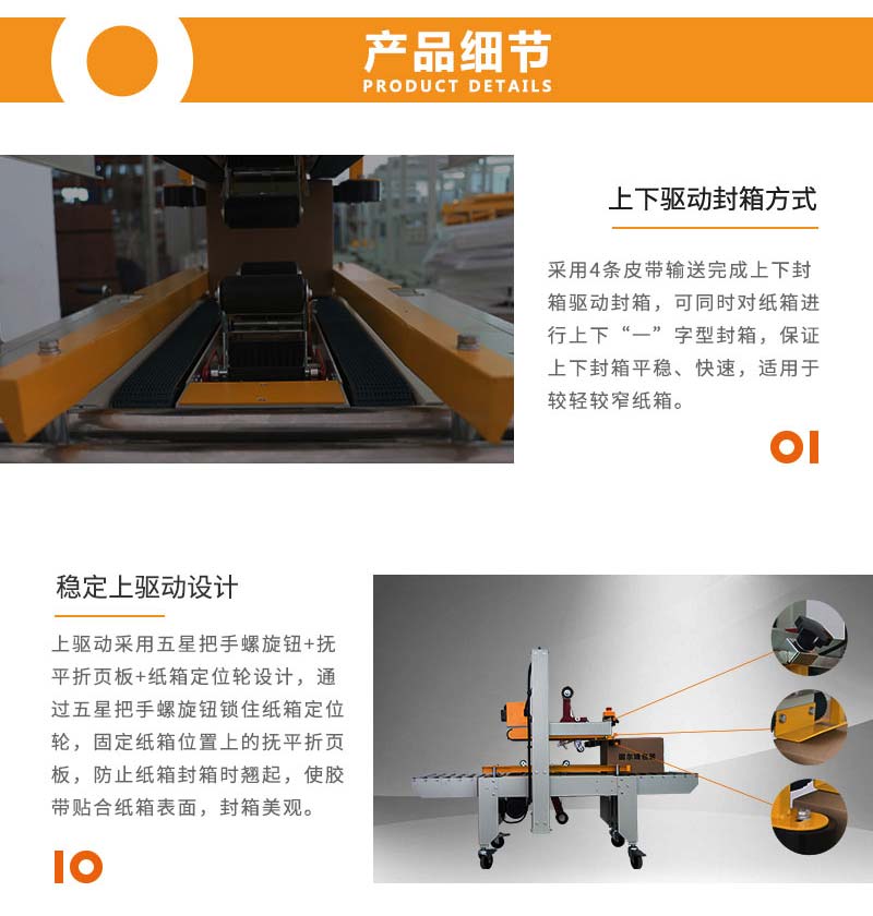 上下驅動封箱機上下皮帶驅動,適合輕型高箱;可同時對紙箱進行上下 “一”字型封箱,上下封箱平穩(wěn)、快速,適用于較輕較窄紙箱。 該款封箱機廣泛應用于食品、醫(yī)藥、飲料、煙草、日化、汽車、線纜、電子等行業(yè)。