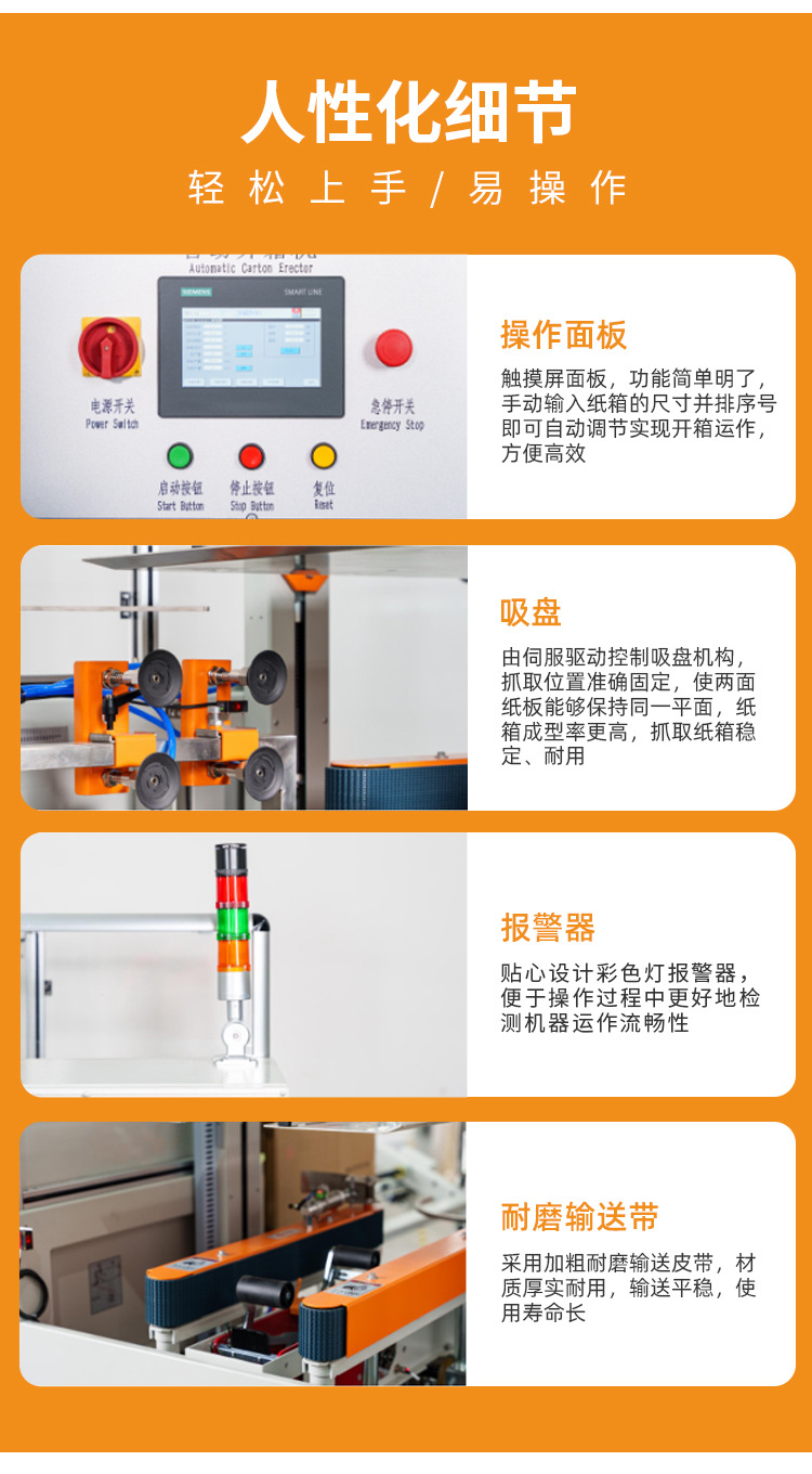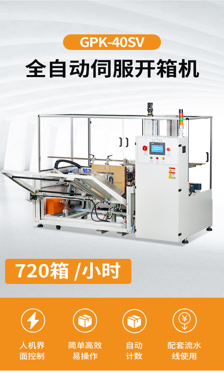 全自動伺服開箱機是一款支持多種規格開箱設備,設置立式料槽,儲料更多,大大節省了紙箱更換調節問題;整機采用電眼自動感應、伺服控制和驅動設計,開箱速度更快更穩,加裝安全防護門,開門即可換膠帶,更方便,省心;同時,整機采用嚴格的生產工藝零部件和伺服驅動開箱,速度達12箱/分鐘,自動吸取紙箱并成型,并加裝了斷膠帶、無膠帶自動報警提示功能,該款開箱機已廣泛用于食品、醫藥、飲料、煙草、日化、電子等各行業。