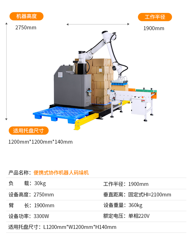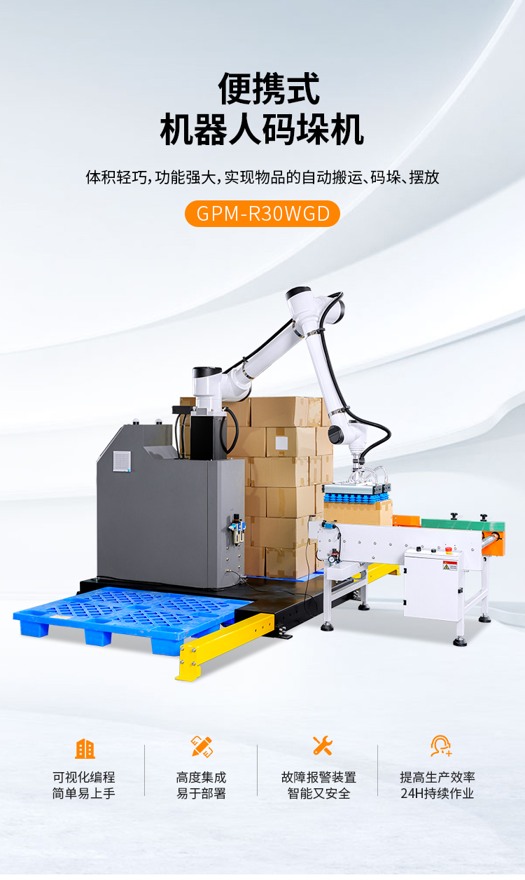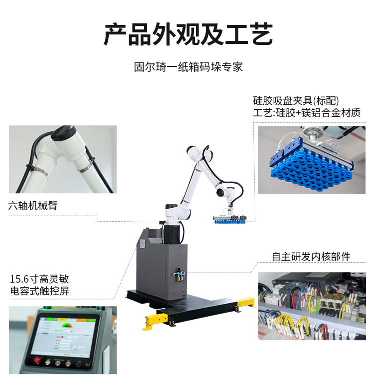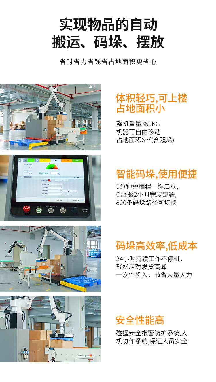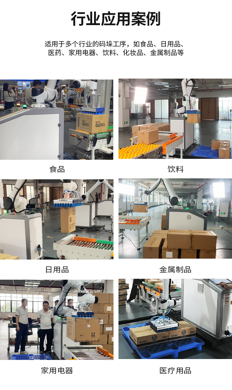 協作機器人碼垛,與人類工作人員緊密合作,提高生產效率、靈活適應不同任務。安全配備傳感器,為工作人員創造更安全高效的工作環境,外形精巧美觀,調整方便簡單,本設備采用觸控屏操作,實現智能化操作管理,簡便、易掌握,可大大地減少勞動人員和降低勞動強度??瑟毩⑹褂靡部膳涮鬃詣庸C和棧板輸送機來實現全自動碼垛系統,廣泛應用于多個行業的碼垛工序,如紙箱類、醫藥類、日用品、食品、飲料、化妝品、金屬制品等。