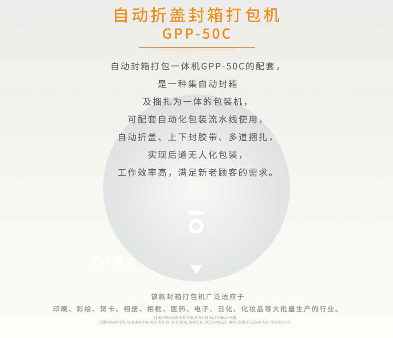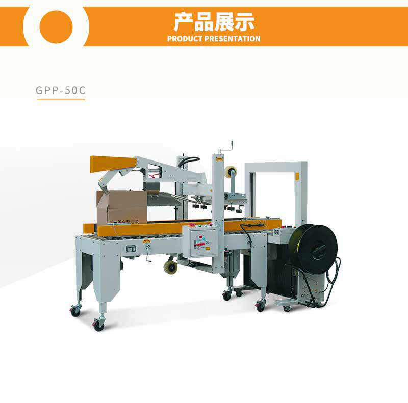 自動(dòng)封箱打包機(jī)GPP-50C+GEQ-200H的配套,是一種集自動(dòng)封箱及捆扎為一體的包裝 機(jī),可配套自動(dòng)化包裝流水線使用,自動(dòng)折蓋、上下封膠帶、多道捆扎, 實(shí)現(xiàn)后道無(wú)人化包裝,工作效率高,快速,平整,美觀工作效率,高更好 滿足新老顧客的需求。廣泛適應(yīng)于印刷、彩繪、賀卡、相 冊(cè)、相框、醫(yī)藥、電子、日化、化妝品等大批量生產(chǎn)的行業(yè)。