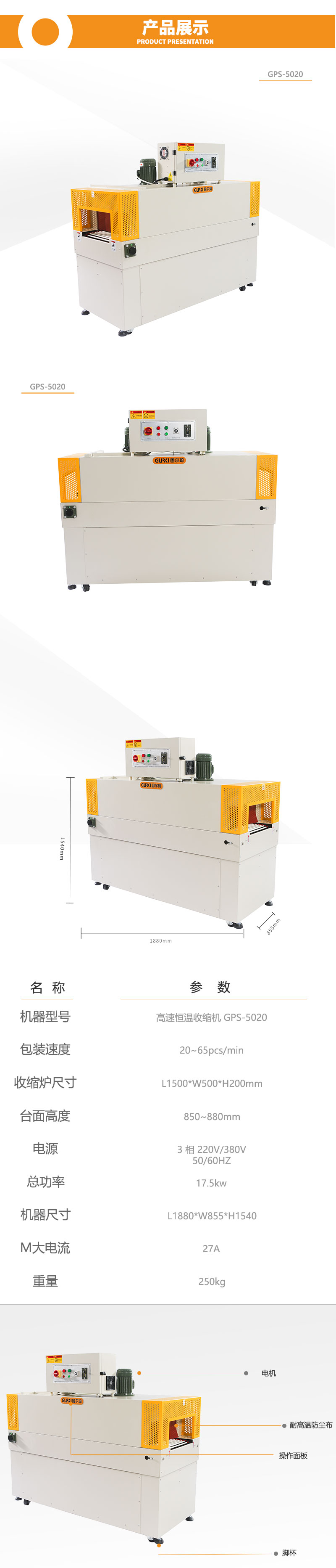 恒溫收縮機(jī)GPS-5020X是我司根據(jù)市場(chǎng)設(shè)計(jì)出的一款升級(jí)版恒溫收縮包裝機(jī),由高性能跟精密組件設(shè)計(jì)而成,運(yùn)轉(zhuǎn)過(guò)程無(wú)振動(dòng),經(jīng)久耐用,操作面板設(shè)計(jì)簡(jiǎn)潔,該機(jī)采用電機(jī)外置,方便維護(hù)設(shè)計(jì),爐長(zhǎng)1.5米,適用更長(zhǎng)物品收縮,可單機(jī)作業(yè),也可與自動(dòng)化包裝流水線配套使用。應(yīng)用行業(yè):該款收縮機(jī)適用于餐飲、日化、醫(yī)藥、禮品、工藝品、玩具、五金、機(jī)械等包裝。